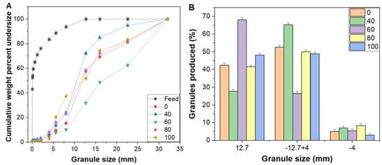 The cumulative weight percent undersize (Figure 6) and granules produced (Figure 7B) at varying PWMC conditions are also presented in Figure 7. The granules produced under pre-wetting conditions were all coarser than their original feed size distributions, which signified particle/granule size growth. PWMC 60% generated more of the coarse granules than all the other PWMCs. It is essential and highly preferred to produce more of the −12.7 +4 mm granules that are narrow in size (high uniformity in size) in order to maximise the bed permeability of granules in a sinter bed before ignition. This is due to the evidence of some of the preliminary works carried out by measuring the granule strength and bed permeability of different granule sizes, which showed an increase in the granule bed permeability with increasing granule sizes, whilst the strength of granules increased with decreasing granule sizes. Therefore, the effect of pre-wetting degree on productivity was based on the production of more of the −12.7 +4 mm size granules and less of the +12.7 and −4 mm size granules. The production of −12.7 +4 mm size granules was 52.6%, 65.3%, 26.5%, 50.1%, and 48.9% for PWMC 0, 40, 60, 80, and 100%, respectively, whilst the +12.7 mm size and −4 mm size granules generated were 42.4 and 5.1%, 27.8 and 7.0%, 68.1 and 5.4%, 41.6 and 8.4%, and 48.2% and 2.9%, respectively.