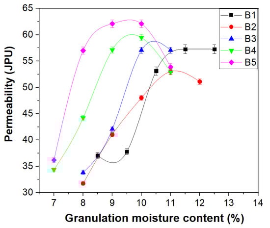 Granulation moisture content (GMC) is the most vital operating parameter that causes a rise in liquid–particle forces such as static capillary forces and dynamic viscous forces, among others [33]. It is also a well-known manifestation that ores with different mineralogy and level of adhering fines require different GMCs to attain the maximum bed permeability and strength essential for subsequent processes like sintering. Thus, it is essential to optimise the GMC of varying SFBs. Extensive research on the influence of moisture content on the granulation and sintering of iron oxide ores and their blends has been conducted [11,12,34,35,36,37,38,39], but on low magnetite concentrate contents (<30%) or other iron oxide ores without magnetite. Therefore, in this study, the influence of GMCs varying from 7–12.5% using SFBs containing high levels of magnetite concentrate (≥30%) is briefly presented. The SFBs (B1–B5) given in Table 1 were used. Granulation conditions were the same as those of the pre-wetting tests except that the GMC was varied while maintaining a constant PWMC at 80% of the GMC for each of the blends tested. The permeability results presented in Figure 8 agreed with the previous studies [34,38,39,40,41], where the granule bed permeability increased initially with the increasing GMC to the maximum bed permeability before dwindling at a higher GMC for all blends.