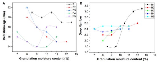 Figure 9. Granule strength by (A) bed shrinkage and (B) drop number at varying GMCs.
