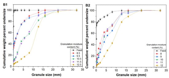 Figure 10. Granule size distribution of SFB B1 containing 100% of magnetite concentrate and SFB B2 containing 70% of magnetite concentrate as a function of GMC.
