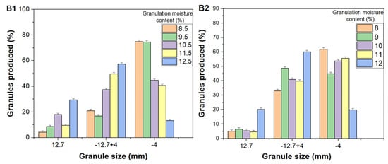 The cumulative weight percent undersize for the granules generated at varying GMCs for SFBs B1 and B2 is presented in Figure 10, and the influence of GMC for the SFBs B1 and B2 on the amounts of +12.7 mm, −12.7 + 4 mm, and −4 mm size granules generated is presented in Figure 11. The size of the granules produced for the blends studied increased with increasing GMC, very similar to the observations made by You, Guo [44]. The interest in this study was not to compare the blends but to focus on the GMC as the impacting operating parameter, as it is crucial to optimise the GMC to improve both the granule strength and bed permeability for the subsequent sintering process. The general increase in the size distributions of all blends studied with increasing GMC is an indication that the fine particles were transformed by the processes of coalescence and pseudo layering into coarse granules, thus suggesting how each granulation process had progressed. The production of coarse granules depicted by the mass of +4 mm size granules generated (Figure 11) also increased with increasing GMC for all blends. Therefore, the combination of the size classes for each GMC that yielded high bed permeability and granule strength by shrinkage was used to establish the optimum GMC. Hence, combining all the results varied with the SFBs, and it can be stated that the optimum GMCs were between 11 and 11.5%, 11%, 10%, 9.5%, and 9% for SFBs B1, B2, B3, B4, and B5, respectively, a clear indication of an increase in the optimum GMC with an increase in the levels of fines/concentrate in the SFBs.