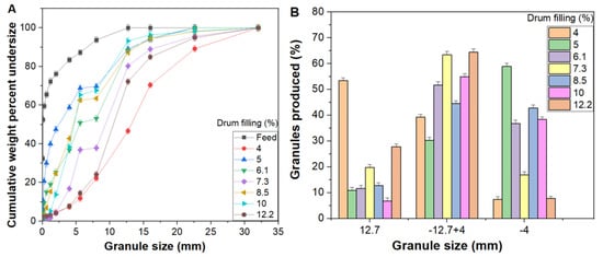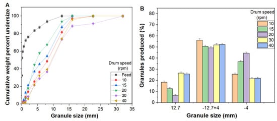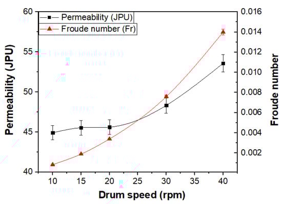 Furthermore, in Figure 14A, the size distributions of granules generated at higher DOSs of 30 and 40 rpm were coarser than the lower drum speeds of 10, 15, and 20 rpm due to the increased rotational kinetic energy of the granules leading to high particle collision frequency. These results agreed with the observations made by Kano, Kasai [45]. The evolution of coarse size +12.7 and −12.7 +4 mm granules in Figure 14B and their higher granule mean sizes (Table 6) confirmed the production of more of the coarse size granules at higher DOSs of 30 and 40 rpm, which caused their bed permeabilities to be higher without necessarily improving their strength and bed permeability.