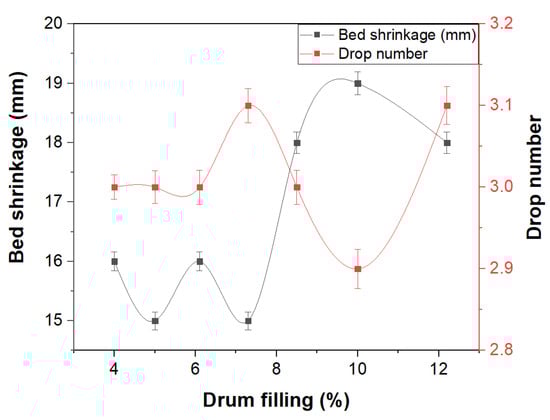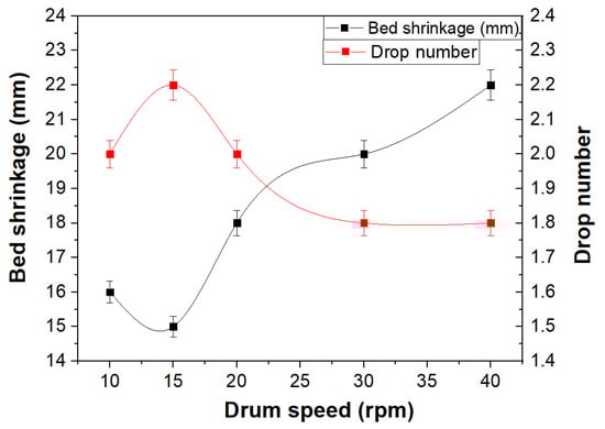 The permeability values in Figure 12 increased with increasing DOS or the corresponding Froude number, but the strength of the granules (both the bed shrinkage and drop number) in Figure 13 decreased with the increasing drum speed, except for the DOS of 15 rpm, which showed a contrasting trend. The maximum permeability of 53.6 JPU was attained at a drum speed of 40 rpm, and the lowest permeability of 44.9 JPU was attained at a drum speed of 10 rpm. This was because more of the larger size granules (+12.7 mm sizes) were generated at 30 and 40 rpm compared with the rest. However, for the granule strength, the DOS of 15 rpm attained the highest drop number of 2.2 and a minimum bed shrinkage of 15 mm, whilst the lowest drop number of 1.8 and highest bed shrinkage of 22 mm was attained at a drum speed of 40 rpm. The results presented were justifications of increased collision, abrasion transfer, and consolidation between the ore particles with increasing DOS. Therefore, the granule size and permeability may increase without necessarily improving their strength if the minimum porosity (Table 6) is not reached at a higher DOS.
