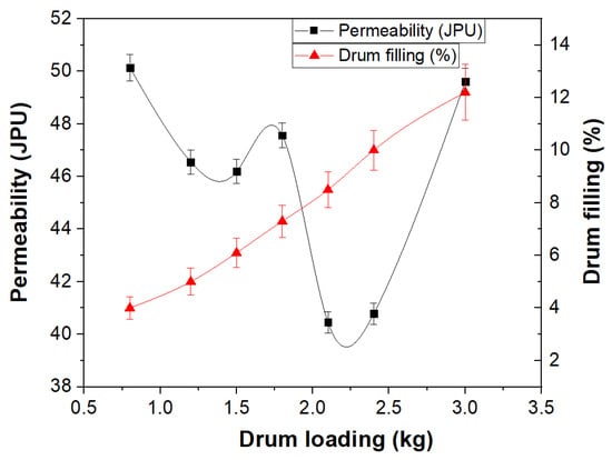 The influence of the drum volume loading (DVL) degree on granulation and product quality was investigated for SFB B10. The granulation conditions were the same as that for the DOS, but at a constant DOS of 15 rpm and 5 min BGT and varied DVLs (i.e., 4.0, 5.0, 6.1, 7.3, 8.5, 10.0, and 12.2%). The permeability values in Figure 15 varied slightly with increasing DVL (or their corresponding drum loading in kg), with a DVL of 4.0% having the highest permeability of 50.1 JPU, followed by 12.2% DVL at 49.8 JPU. The lowest permeability of about 41.0 JPU was attained by the DVL of 8.5 and 10%. Therefore, only the 4.0 and 12.2% DVLs had values closer to the desirable bed permeability (60 JPU). The strength of the granules (by bed shrinkage) generally decreased, suggesting that the granules produced became weaker with the increasing DVL, except for the DVLs of 5.0 and 7.3% (Figure 16). The trends in their drop numbers were similar to those of the bed shrinkages. The DVLs of 4% and 12% (corresponding to 0.8 and 3.0 kg, respectively) attained the optimum bed permeability and granule strength. In Figure 17, coarser quasi granules were produced for all the DVLs, and some of the granules were reasonably coarse.