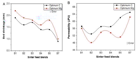 Furthermore, the strength of the granules measured by bed shrinkage and drop number, as shown in Figure 9, indicated that the granule strength generally improved with an increase in the GMC for all blends, which was consistent with the limonite granulation studies by Zhao and Xue [39]. This was due to the development of more capillary, interlocking, and other forces (e.g., viscous force) that come into play in the presence of moisture and their interaction with ore particles. The strength results from the bed shrinkage and drop number for the blend containing the 100% magnetite concentrate (B1) and the blend containing 40% magnetite concentrate (B5) were contradictory. For instance, in SFB B1, the bed shrinkage continued to decrease except for 9.5% GMC, where it increased slightly, whilst the drop numbers continued to increase with increasing GMC. Again, the bed shrinkage showed a clear indication of the bed strength that approached the minimum shrinkage (i.e., maximum bed strength) at the optimum GMC, and thereafter, improved only marginally for B1 and B2 but increased significantly for B4 and B5, unlike the drop number that increased continuously for all blends. Therefore, for the SFBs containing high levels of magnetite concentrate, the drop number is not a suitable criterion for determining the granule strength in order to optimise the GMC because the drop number will continue to increase with increasing GMC. This is because the granules will not fracture easily but change their shape as the GMC increases, even if the granules are weak.