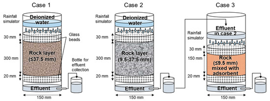 Figure 1 illustrates the schematic of the experimental columns, designed to simulate the movement of water through packed granular materials. Water introduction into the columns vary, with options for both continuous and intermittent flow, and down-flow and up-flow directions [40,42,43]. Each configuration is tailored to suit different experimental needs or to replicate various environmental conditions. In this study, an intermittent down-flow approach was selected to replicate conditions analogous to rainwater infiltration and subsequent percolation, resulting in an unsaturated flow of water. To evaluate As migration from the rock layer and its attenuation by the bottom sorption layer, three experimental cases were constructed in the column setup.