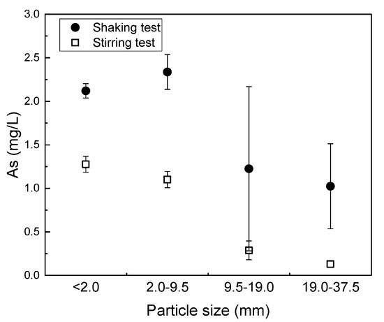 The results of batch leaching tests for the rock samples under shaking and stirring for each particle size are illustrated in Figure 2. Under shaking conditions, As leaching concentrations were 2.1, 2.4, 1.2, and 1.0 mg/L for particle sizes < 2, 2.0 to 9.5, 9.5 to 19.0, and 19.0 to 37.5 mm, respectively. In contrast, under stirring conditions, the corresponding concentrations were lower at 1.3, 1.1, 0.2, and 0.15 mg/L, respectively. The results indicate that smaller particles exhibited elevated As concentrations irrespective of agitation conditions with shaking inducing significantly higher As concentrations of ca. 1.6, 2.2, 6.0, and 6.7 times greater than those observed under stirring. The increased agitation under shaking conditions likely caused more frequent collisions, leading to finer particles and enhanced As dissolution. As shown in Figure S6, 15 to 42% of the rocks were reduced to <2 mm under shaking (Figure S6a), whereas, during stirring (Figure S6b), <5% of the rocks were reduced to <2 mm.