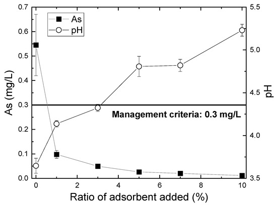 Batch immobilization tests were conducted by mixing the rock samples with Fe-based adsorbent (Figure S4). The rock samples used in these tests consisted of a mixture of 2.0–9.5 mm and <2.0 mm fractions at a 1:1 weight ratio. The Fe-based adsorbent was added to the rock sample at a mass ratio of 1, 3, 5, and 10%. After mixing, the samples were cured for one day at room temperature, then lightly crushed, and subjected to the batch shaking tests methodology described in Section 2.2. After the batch leaching tests, the filtered leachate was analyzed for As leaching concentrations and pH.