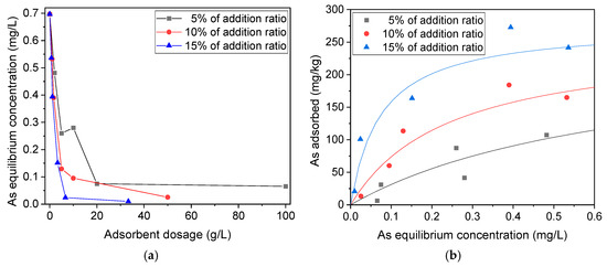 Equilibrium As concentration with adsorbent dosage (a) and As adsorbed onto the immobilized sieved excavated rock samples with Fe-based adsorbent with the provisional approximation of Langmuir isotherms (b) in sorption test.