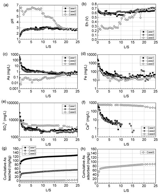 The Eh changes (Figure 6b) in Cases 1 and 2 indicated a similar trend ranging from 0.6 to 0.7 V. In Case 3, the Eh indicated reductive conditions, initially at around 0.2 V. This value fluctuated up to 0.4 V until the L/S reached 10. It gradually increased and fluctuated again between 0.4 and 0.6 V before stabilizing at an Eh value similar to those of Cases 1 and 2, observed at the L/S of 20. The reductive condition observed in Case 3 is likely due to the oxidation of easily reduced Fe particles in the Fe-based adsorbent, and Fe particles adsorbing As leached from the rock layer could be stabilized to be Fe oxide [56,57,58].