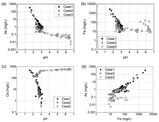 To evaluate the stable phases of As and Fe under each test condition, Eh-pH diagrams were depicted using the Geochemist’s Workbench® [46] based on their actual solute activities measured in the effluents. This modeling was applied to the results of column experiments for three cases. The activities used in this study were the initial water chemistry of the effluent from each three columns, Cases 1, 2, and 3.