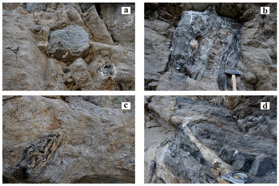 The thickness of the tectonic lenses reaches 1–2 m, the length is several meters (Figure 4). Figure 4a shows the general appearance of the tectonic mélange. The matrix is represented by granite gneisses, which include oval blocks of quartz–biotite, garnet–biotite, and quartz–biotite–garnet–sillimanite schists of various sizes (up to 70 cm).