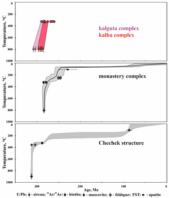 Thermochronological history of the Kalba–Narym Batholith granitoids and Chechek structure. The points corresponding to the Kalgutin complex (cherry), the Kalba complex (red) are highlighted in color. The sources of the dates are given in Table 1.