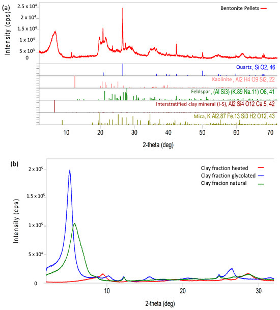 Figure 2a displays the X-ray diffractogram of the bentonite pellet (total powder). To enhance the interpretation of the diffractogram, particularly for identifying clay minerals, the clay fraction underwent additional analyses, which included heating at 500 °C for 2 h and treatment with ethylene glycol, as shown in Figure 2b. These techniques were employed based on the principle that ethylene glycol treatment expands the basal spacing of smectites to 17Å, while heating at 500 °C dehydrates kaolinites and reduces the basal spacing of smectites. Therefore, the mineral identifications presented in Figure 2a incorporate the results from these additional tests.
