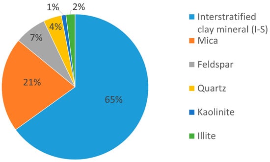 In general, it is possible to observe, through the X-ray diffractogram, peaks indicative of the presence of interstratified clay minerals illite–smectite (IS), evidencing the reactive nature of the bentonite pellet sample with a high degree of expansion. Additionally, peaks associated with the presence of mica, feldspar, and quartz can be identified, as well as moderate peaks that denote the existence of clay minerals corresponding to kaolinite.