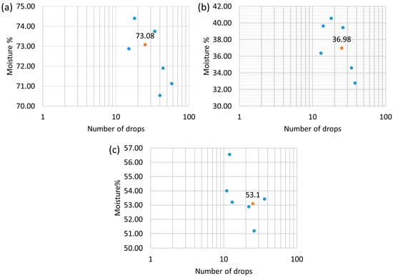 Figure 4. Liquid limit for the pellet sample with (a) water, (b) glycerin, and (c) water with glycerin.