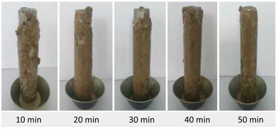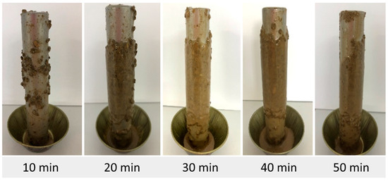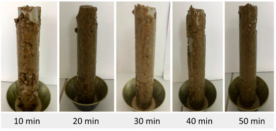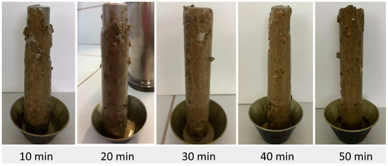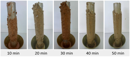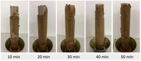 Figure 5, Figure 6, Figure 7, Figure 8, Figure 9, Figure 10 and Figure 11 show the appearance of the pellets accreted to the steel bar, for each fluid studied, for times of 10, 20, 30, 40, and 50 min.