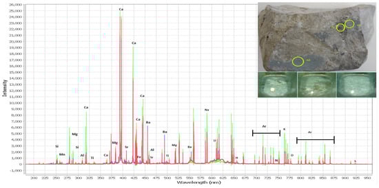 The presence of very important light CRMs like Li, Be, and B cannot be investigated using the XRFS technique. To overcome this drawback, preliminary LIBS measurements were carried out on some ACBFS lumps at SciAps Laboratory (Krefeld, Germany) using the SciAps Z903 LIBS Analyzer instrument. The instrument uses an NdYAG laser with a wavelength of 1064 nm. The laser pulses are emitted with a frequency of 50 Hz and have an energy output of approx. 6 mJ. All measurements on the samples were taken using the instrument’s built-in argon flush system, which greatly increases the intensities of the spectra. A gating period of approximately 650 ns between plasma ignition and the acquisition of spectral data was used to improve the signal-to-noise ratio. Each location chosen for analysis was measured with 16 singular spots in a 4 × 4 grid, amounting to a size of approx. 2.25 mm2. The spectra from all 16 individual spots were averaged into a singular spectrum, which is consequently used for semi-quantitative and qualitative analyses using SciAps Profilebuilder software.