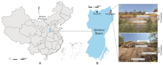 Location of the Qinshui Basin and the study area (Yangquan) in north China (modified from [26]). (A) China map; (B) Qinshui Basin; (C,D) outcrops of the Upper Carboniferous Benxi Formation in the study area.