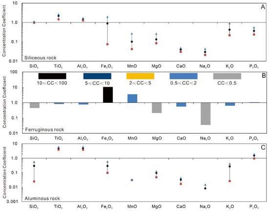 Concentration coefficient (CC) of major element oxides in the “Si–Al–Fe” strata from the northeastern Qinshui Basin. (A) siliceous rock; (B) ferruginous rock; (C) aluminous rock. The solid triangles, circles, and squares in (A,C) represent the maximum, average, and minimum values of CC in siliceous and aluminous rocks, respectively. CC is the ratio of trace element concentrations in analyzed samples relative to those in the UCC as reported by McLennan [38].
