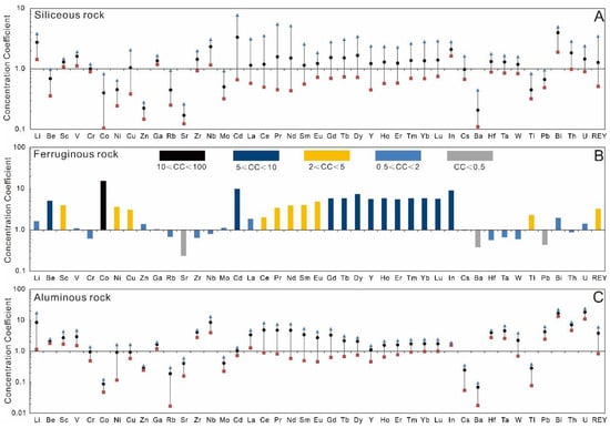Concentration coefficient (CC) of trace elements in the “Si–Al–Fe” strata from the northeastern Qinshui Basin. (A) siliceous rock; (B) ferruginous rock; (C) aluminous rock. The solid triangles, circles, and squares in (A,C) represent the maximum, average, and minimum values of CC in siliceous and aluminous rocks, respectively. CC is the ratio of trace element concentrations in analyzed samples relative to those in the UCC as reported by McLennan [38].