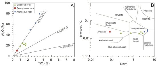 The Al2O3/TiO2 ratio is widely used to discern the source of volcanic ash in coal-bearing sequences [19,59,60,61], the origin of inorganic matter in coal seams [28,62], and the provenance of clastic material in sedimentary rocks [63,64], owing to its relatively immobile geochemical behavior during both primary and secondary geological processes. Typical ranges for Al2O3/TiO2 ratio are 3–8, 8–21, and 21–70, which correspond to mafic, intermediate, and felsic parent rock types, respectively [64]. In this study, the Al2O3/TiO2 ratios of the siliceous rocks (samples YQ-1 to YQ-5) range from 12.06 to 19.31, while the ferruginous rock (sample YQ-6) has a ratio of 20.52, and the aluminous rocks (samples YQ-7 to YQ-9) range from 21.09 to 23.06 (Figure 6A), suggesting that the siliceous and ferruginous rocks likely originate from intermediate parent rocks, whereas the aluminous rock is probably derived from felsic sources. Furthermore, the studied samples predominantly fall within the intermediate–felsic region on the Nb/Y-Zr/TiO2 diagram proposed by Winchester and Floyd [65], including compositions such as trachyandesite and andesite (Figure 6B).