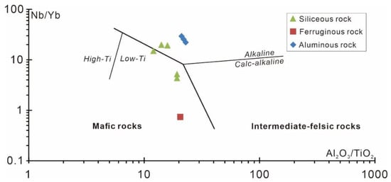 The magma source discrimination diagram of Al2O3/TiO2 vs. Nb/Yb (modified from [70]) of the studied samples from the “Si–Al–Fe” strata.