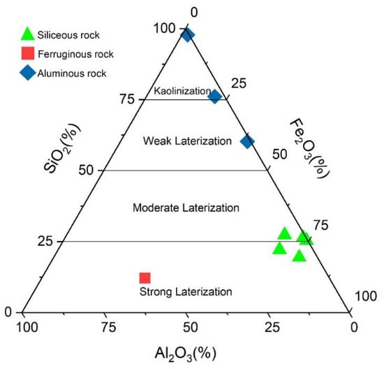 SiO2—Al2O3—Fe2O3 ternary diagram showing the laterization degree of the studied samples from the “Si–Al–Fe” strata (modified from [73]).