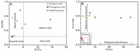 Cross plots presenting paleoclimatic (A) (Sr/Cu vs. Ga/Rb) and paleoredox (B) (Ni/Co vs. V/(V + Ni)) conditions. The dashed lines indicate the ranges of the coordinate axes corresponding to the paleoclimatic and paleoredox conditions.