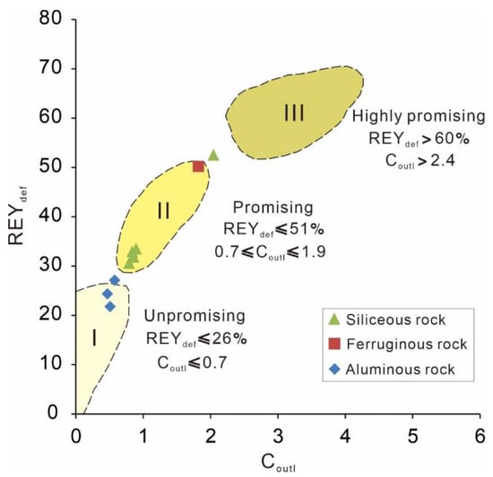 The distribution of REY concentrations among all studied samples is not uniform. The REY contents in siliceous rocks (samples YQ-1 to YQ-5) are relatively low, ranging from 86.29 to 583.71 μg/g. In contrast, the ferruginous rock (sample YQ-6) has a concentration of 541.42 μg/g, while the aluminous rocks (samples YQ-7 to YQ-9) exhibit higher concentrations, ranging from 139.04 to 1017.26 μg/g (Table 2). Furthermore, by comparing the total REY content in these rock types with the average values of the UCC, it is observed that the siliceous rocks fall within the normal range (CC = 1.28), whereas both the ferruginous and aluminous rocks show slight enrichment (CC = 3.22, and 3.82, respectively).