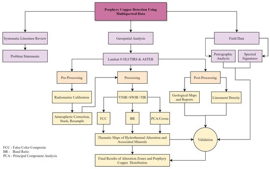The economic development of a country depends largely on its mineral resources. Society’s increasing demand for minerals due to exponential population growth and industrialization makes it necessary to replenish dwindling reserves by searching for new ore deposits. Remote sensing technology can bring new impetus and cutting-edge technology to mineral exploration and identification of ore mineralization zones, especially in challenging environments and complex geological settings where conventional methods may have limited applications [1,2,3,4,5,6,7]. By using sophisticated sensor systems mounted on satellites or airplanes, data can be collected from large areas [8,9,10,11,12,13,14]. Therefore, a systematic mineral exploration program that uses remote sensing technology is necessary for the steady growth of developing countries. Porphyry deposits are key sources of valuable metals, such as copper (Cu), molybdenum (Mo), gold (Au), silver (Ag), tin (Sn), and critical metals (as by-products), such as rhenium (Re), tungsten (W), indium (In), platinum (Pt), palladium (Pd) and selenium (Se). Their undeniable economic importance lies in their role as key suppliers of strategic raw materials for a variety of industries and modern technologies [15,16,17,18,19].