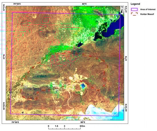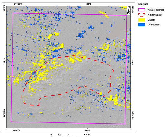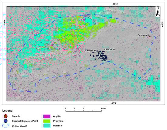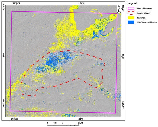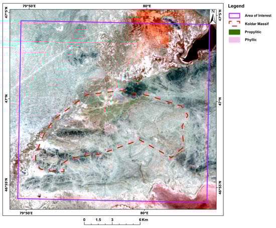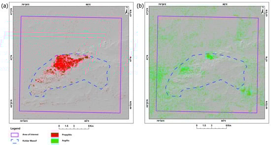 Furthermore, the application of BRs to ASTER data to locate argillic hydrothermal alteration zones based on diagnostic mineral assemblages showed promising results consistent with those from Landsat-8 data. Kaolinite, which was identified using the B4/B6 ratio, has a wider spatial distribution in the study area compared to illite–montmorillonite, which was mapped using the (B7 + B5)/(B6 + B9) ratio. Based on these results, argillic alteration zones are predominant in the Koldar Massif and the surrounding northeastern and southeastern regions. Within the Koldar Massif and the study area, these zones have a northeast–southwest orientation that coincides with the ongoing Aktogai mining operation (Figure 9). Due to the spectral similarity between the alteration minerals, the surrounding vegetation and the minerals from different alteration zones, some of the discovered alteration minerals were initially misclassified. However, to increase the reliability of the results, the Quaternary vegetation and sedimentary formations in the northeast of the study area were carefully masked based on the findings from the FCC results and the existing geologic and field data. This approach effectively distinguished between alteration zones and unaltered areas, as shown in Figure 7, Figure 8 and Figure 9.