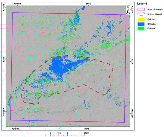 Processing of ASTER data provided results in the detection of potassic alteration zones in the study area. BRs of (B11 × B11)/B10/B14 and B14/B12 effectively identified orthoclase and quartz, minerals indicative of potassic alteration, near and northwest of the Kolar Massif within the Aktogay copper deposit (Figure 7). Propylitic alteration minerals (calcite, chlorite and epidote) were also successfully mapped using B5/B8, (B6 + B7)/(2 × B8) and (B6 + B9)/(B7 + B8), respectively (Figure 8). This propylitic alteration zone is spatially associated with other alteration zones that are characteristic of porphyry copper deposits and have been identified using complementary methods. It is noteworthy that calcite and chlorite are more widespread in the study area than epidote. The results show that the Kolar Massif is surrounded by NE-SW trending propylitic alteration zones (Figure 8).