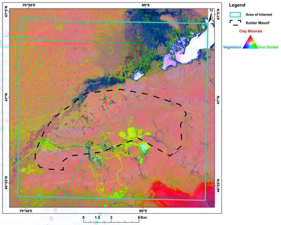 Accordingly, an RGB color composite of PC3, PC4 and PC2 was selected for the visualization of the Landsat-8 PCA results (Figure 10), as this combination optimally highlights the hydrothermally altered zones and associated minerals. To improve the contrast and clarity of the image, the negative loadings of the selected components were inverted by multiplying by −1. The RGB composite image effectively differentiates various geological features. Vegetation and alluvium appear in shades of blue, while water bodies are represented by shades ranging from white to light blue. Iron oxides and hydroxides, important indicators of oxidation zones, are highlighted in light green. The most intense green coloration corresponds to the Aktogay porphyry copper deposit, indicating a high concentration of iron-bearing minerals such as hematite, goethite and limonite. Clay minerals associated with hydrothermal alteration are shown in red and form a clear contrast to the oxidation zones (Figure 10).