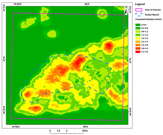 Distribution of lineament density extracted from DEM using the LINE algorithm in PCI Geomatica over the study area.