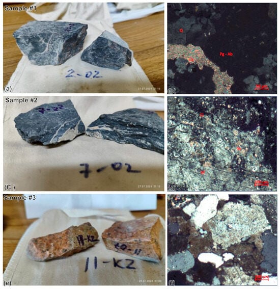 Specimens and thin sections of the collected samples under a 20× polarized microscope: (a) sample photo of hornblende granodiorite; (b) distribution of calcite in a plagioclase–orthoclase–quartz matrix under crossed Nicols; (c) sample photo of dacitic tuff; (d) alteration of feldspars under crossed Nicols; (e) sample photo of granodiorite; (f) politicization process on orthoclase and sericitization alteration on plagioclase.