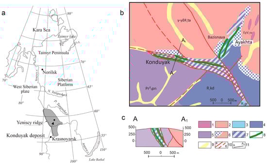 - Serdyuk, S.S.; Zonov, V.A. Predictive assessment of gold content of the Ayakhtinsky ore cluster (South Yenisei gold-bearing region). In Geology and Mineral Resources of Central Siberia; KNIIGiMS: Krasnoyarsk, Russia, 2003; pp. 96–103. (In Russian) [Google Scholar]