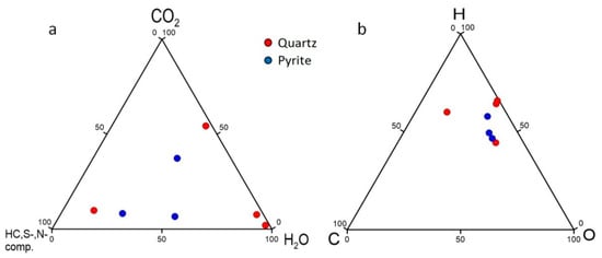 - Gaboury, D. Volatile Composition of Fluid Inclusions in Gold-Bearing Quartz Veins Analyzed by Solid-Mass Spectrometry: Method and Contributions to the Orogenic Metallogenic Model and Exploration. In Ore Geology [Working Title]; IntechOpen: London, UK, 2024. [Google Scholar] [CrossRef]