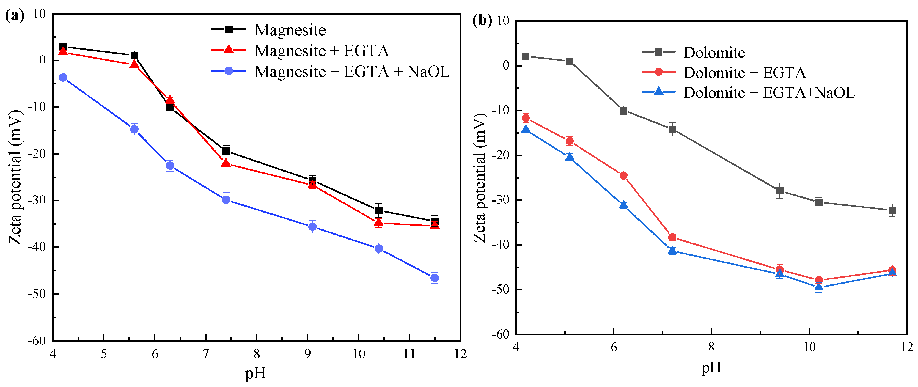 - Wang, Y.; Tian, J.; Han, H.; Sun, W.; Zhang, X. The enhanced flotation separation of magnesite and dolomite by introducing chelating reagent EDTA. Colloids Surf. A Physicochem. Eng. Asp. 2024, 682, 132969. [Google Scholar] [CrossRef]