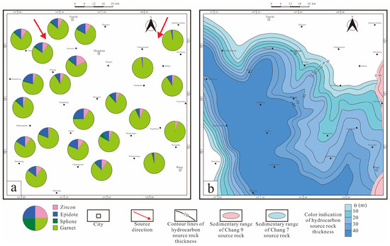 Distribution characteristics of source rocks and hydrocarbon source rocks in the Dingbian area, Ordos Basin: (a) distribution of heavy minerals in the Chang 9 section of the Dingbian area; (b) distribution characteristics of hydrocarbon source rocks in the Dingbian area.