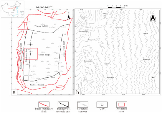 The Ordos Basin is located in northern-central China and covers an area of approximately 25 × 104 km2. It is characterized by overall uplift and subsidence, with migrating depocenters and relatively simple tectonics. The basin is classified as a large, multi-cycle cratonic basin [31]. Based on current tectonic activity and geological evolution, previous studies have divided the basin into six regional tectonic units: the Yishan Slope, the Western Jinxi Flexural Zone, the Tianhuan Depression, the Western Boundary Fault Zone, the Yimeng Uplift, and the Wei Bei Uplift [32]. The Yishan Slope region within the basin is relatively flat, with an overall westward dip and localized anticlinal structures.