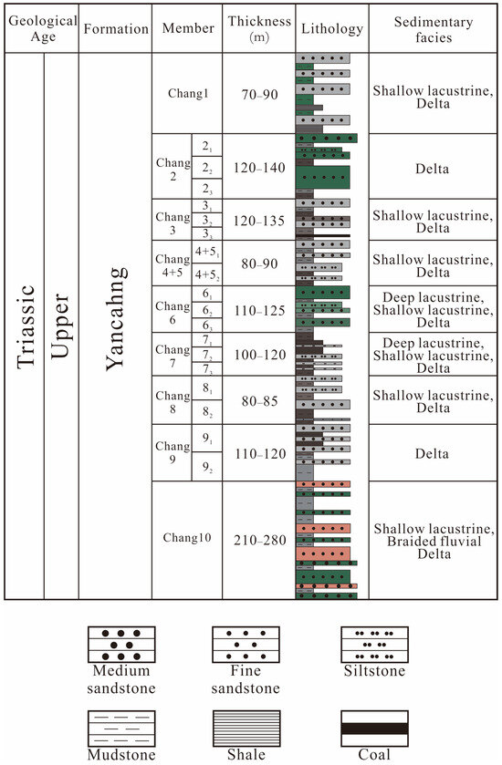 The Yanchang Formation in the Ordos Basin consists of a set of gray-green and gray medium-thick fine sandstones, siltstones, and dark gray to gray-black mudstones. The lower part is dominated by medium- to coarse-grained fluvial sandstone, while the middle part features lake-delta deposits. The upper part consists of river and lake-delta sandstones and mudstones. The grain size of the Yanchang Formation generally decreases from north to south, with thickness decreasing to the north and increasing to the south. The total thickness ranges from 800 to 1500 m. Lithologically, the formation shows clear rhythmic variations, with multiple cycles of deposition. These variations are highly comparable regionally, and the formation is subdivided into ten segments based on shale, carbonaceous mudstone, coal seams, and other marker horizons, as well as their distinctive features on the well [33].