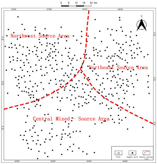 This study aims to identify the main controlling factors for hydrocarbon accumulation in the Chang 9 reservoir of the Dingbian area, under a multi-source system. To achieve this, the research focuses on oil–source comparison, reservoir characteristics, reservoir types, and crude oil properties. Based on the directional distribution of source areas and previous studies on the sedimentary environment and facies in the Dingbian region [33], the study area is divided into three regions: the northwest source area, the northeast source area, and the central mixed source area.