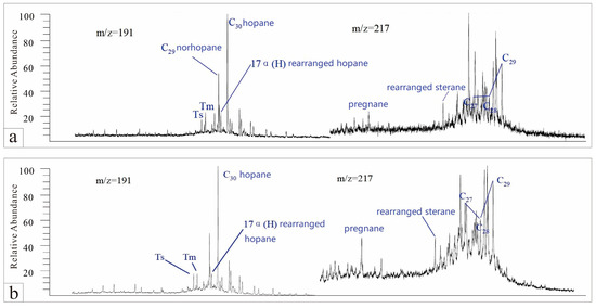 Biomarker chromatograms of steranes and terpanes from the Chang 9 hydrocarbon source rocks in the Dingbian area: (a) Sample 3 (Chang 9 source rock, 1410.89 m) sterane and terpane chromatogram; (b) Sample 4 (Chang 9 source rock, 1335.3 m) sterane and terpane chromatogram.