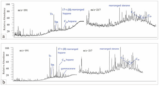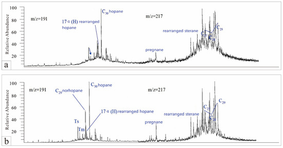 Biomarker chromatograms of steranes and terpanes from crude oil in the Chang 9 reservoir in the Dingbian area: (a) Sample 5 (Chang 9 crude oil, 2756–2758 m) sterane and terpane chromatogram; (b) Sample 6 (Chang 9 crude oil, 2348 m) sterane and terpane chromatogram.