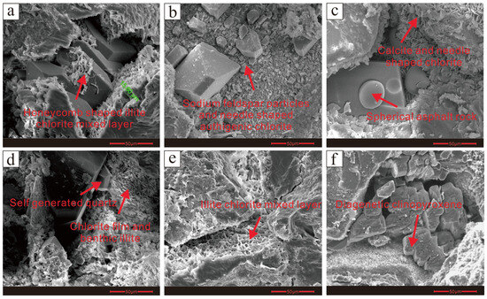 Scanning electron microscope (SEM) observations revealed the morphological characteristics of authigenic clay minerals in the Chang 91 sandstone reservoirs. Honeycomb-like illite–smectite mixed layers were observed growing on the surface of particles. Chlorite films were found to grow in a sheet-like structure, vertically aligned on the surface of clasts, while acicular chlorite filled the pores between the particles. Additionally, other types of flaky clay minerals were observed. In terms of quartz, both secondary and authigenic quartz were found filling the pores between the chlorite film particles. Notably, both types of quartz exhibited high idiomorphic degrees, indicating well-developed intergranular pores during their growth. Furthermore, well-formed calcite was observed filling the pores in particles attached to chlorite films [39].
