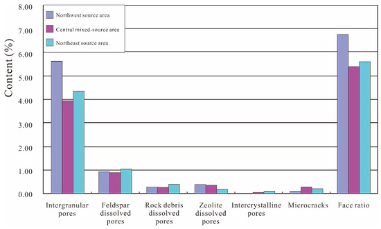 The northwest source area has the highest porosity rate and develops a variety of pore types. Overall, all three source areas are dominated by intergranular and feldspar dissolution pores, with lithic fragments and zeolite dissolution pores being secondary pore types (Figure 10) [39].