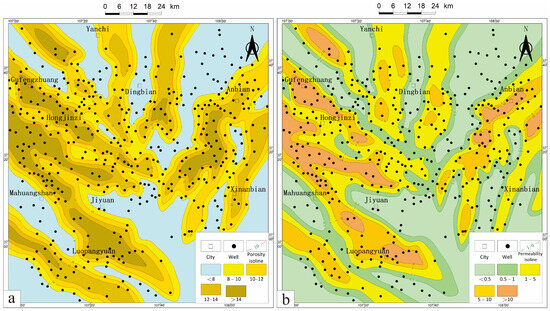 Planar distribution characteristics of reservoir physical properties in the Dingbian area, Ordos Basin: (a) porosity contour map for Chang 9 reservoirs in the Dingbian area; (b) permeability contour map for Chang 9 reservoirs in the Dingbian area.