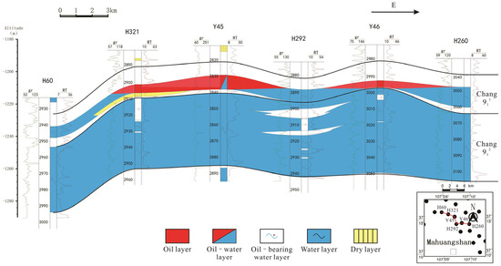 In the northeast source area, the Chang 7 source rock was deposited at the delta front, with underwater distributary channel sand bodies developed. However, the thickness of the dark to black mudstones is relatively thin. When the Chang 7 source rock in the lake basin matured and began to expel hydrocarbons, the oil migrated laterally along the extensive Chang 9 sand bodies, which were deposited in a stacked and continuous manner. At this time, the top of the Chang 9 formation exhibits a relatively gentle structure with minimal structural variation. Even though minor tectonic adjustments occurred during later movements, their impact on the reservoir was limited. Oil primarily accumulated in sand bodies with better physical properties, with minimal oil–water differentiation. In this area, the oil is largely controlled by lithology. Additionally, due to the strong heterogeneity and relative tightness of the reservoirs, some oil and gas accumulate in the downdip portions of the sand bodies rather than migrating upward.