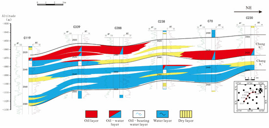 When examining the profile along the dip direction of the nose-like structure, wells C70 and C230 are located above different channel sand bodies, while wells C119, C339, and C288 are positioned above other channel sands. In the updip direction, the sand bodies gradually thin and are increasingly covered by mudstones, resulting in the formation of two traps. Well C238, located in the underdeveloped Chang 911 sandstone body, did not form a reservoir due to insufficient development. However, in the well-developed Chang 912 sandstone body, a successful oil reservoir formation occurred (Figure 14).